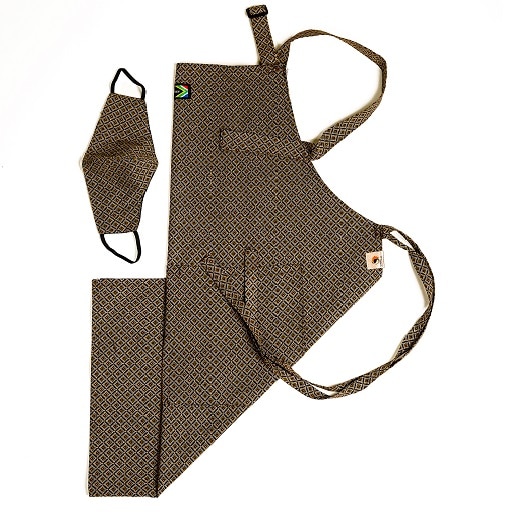 Unique Apron with matching face mask to stay safe and protect you from Covid-19. Garments are hand washable and can be ironed on low heat.