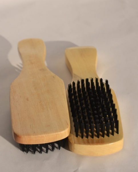 Handheld beard brush with synthetic bristles.