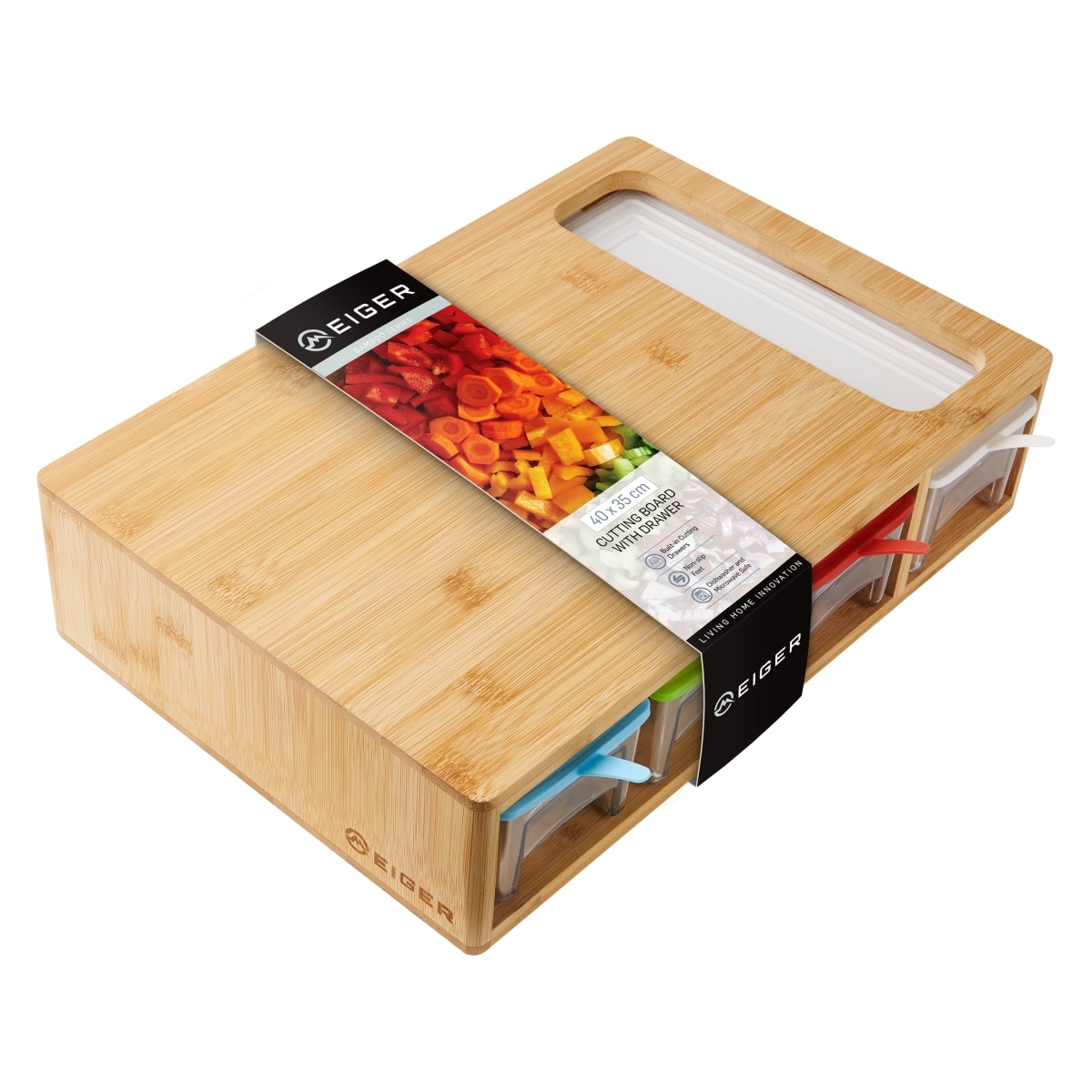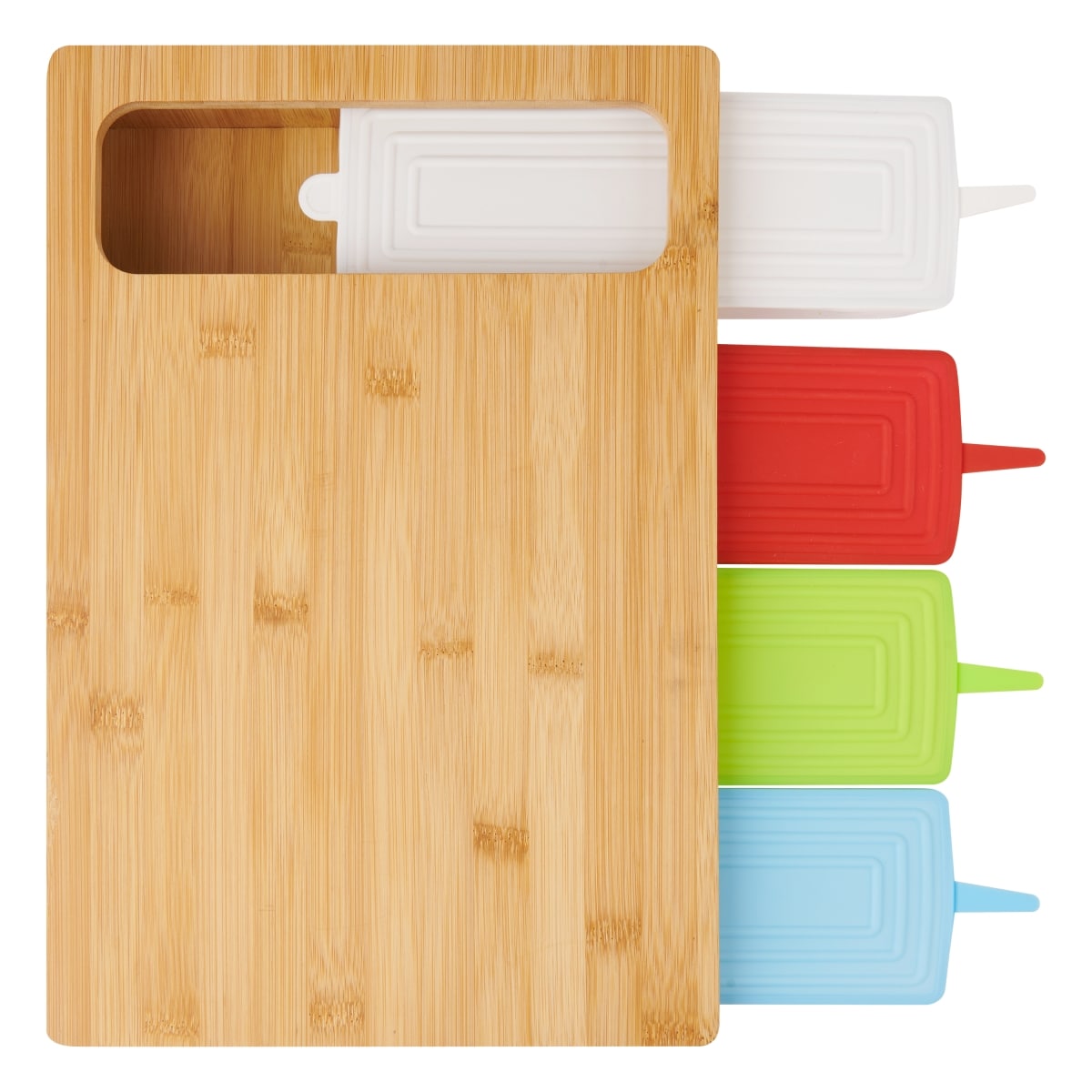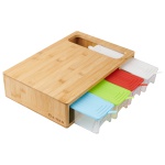 This unique and practical bamboo chopping board is a must for the organized chef! Simply slide your prep through the hole and into the waiting container, seal with the colour-coded, LFGB approved silicone lids and slide into the storage space below the cutting board. The containers are stackable, to save space in your fridge