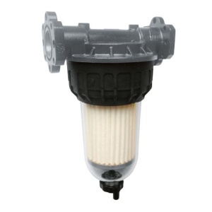 Cartridge filter with transparent container and removable inner cartridge can be applied on both suction and delivery. They are available with water absorbing cartridge. The amount of impurities or water present are immediately visible in the transparent container. Any water or impurities are cleaned out by a valve set in the bottom of the container.