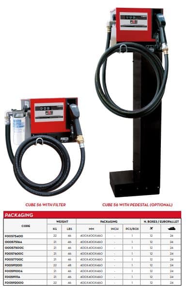 The characteristic of this diesel dispenser is that it can be adapted to different applications. In fact, it is possible to apply CUBE 56-70-90 on tanks, on the wall, on cisterns, on drums or on its special pedestal.
