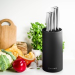 Presented in a sleek black knife block, this set includes a 20 cm chef’s knife, an 18 cm santoku knife, a 13 cm utility knife, and a 10 cm paring knife.