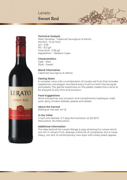 A complex wine with a combination of mostly red fruit that includes raspberries, red pepper, and blackberry fruits on both the bouquet and palate. The gentle sweetness on the palate makes this a wine to be enjoyed at any time and occasion.