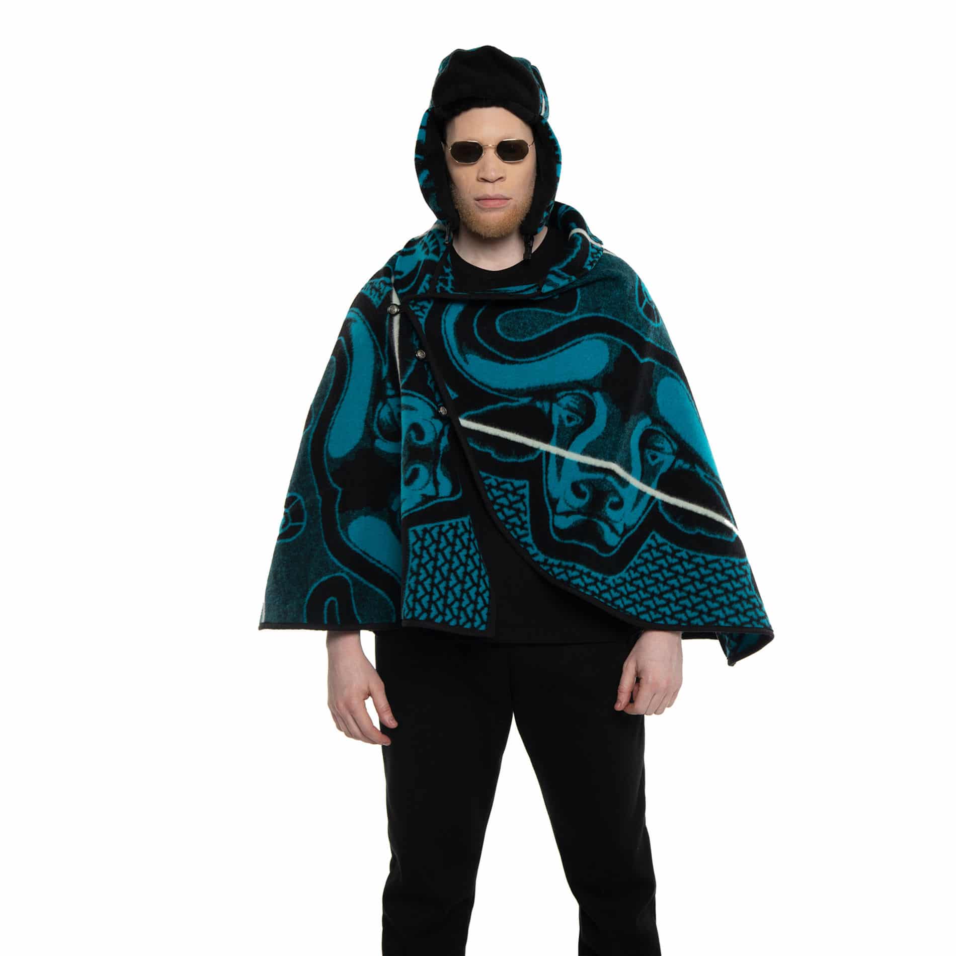 Blue unisex poncho made from the Linare Basotho blanket.