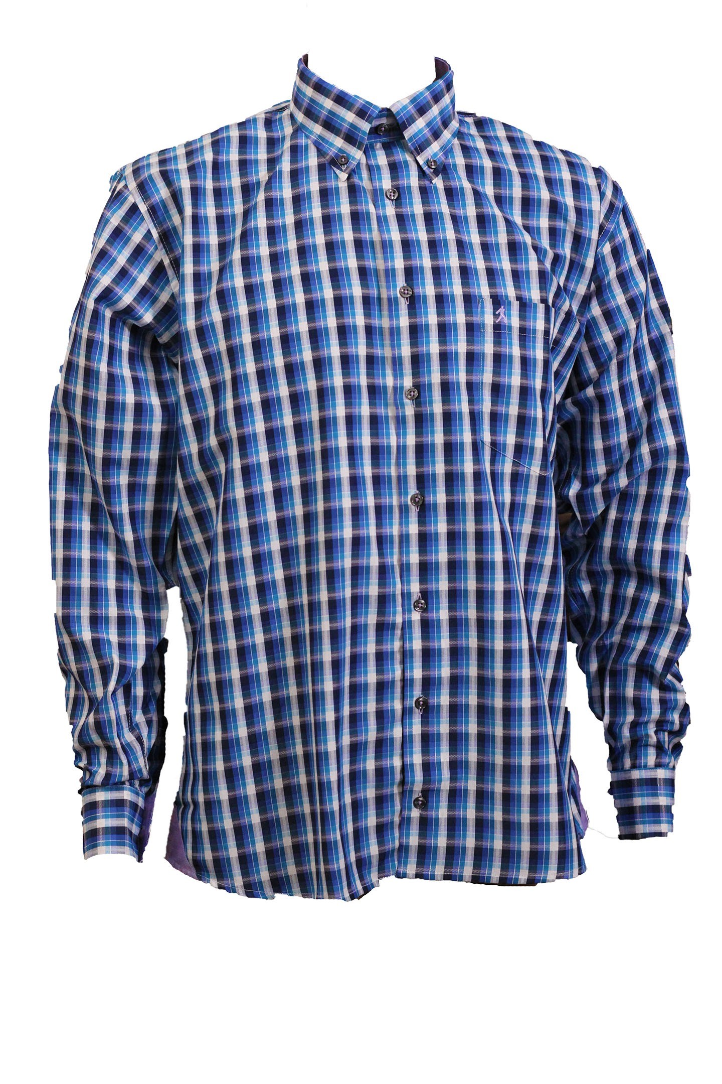 Phashash presents the VIRESH, a Teal / Airforce Blue/ Navy check button down cotton shirt, with Lavender inner placket, inner collar, inner cuffs and side tippings