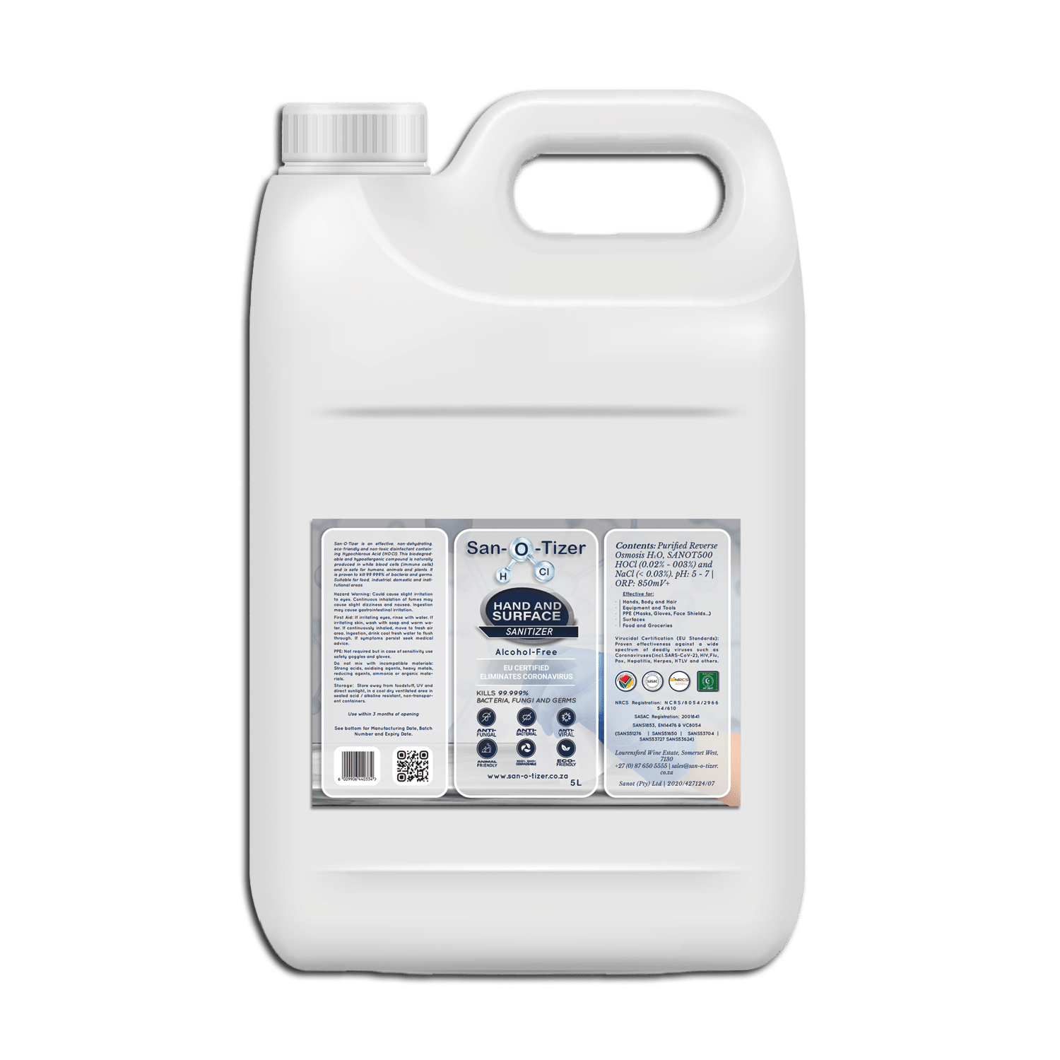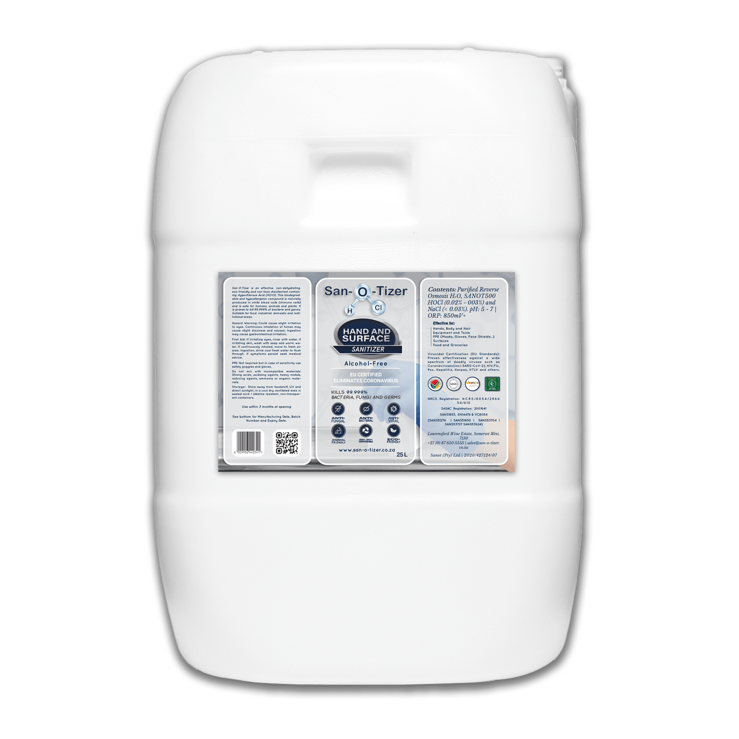 San-O-Tizer is the perfect disinfecting solution for your basic hand and surface sanitization needs. This medical- and food-grade product is completely safe, non-toxic, non-dehydrating, hypoallergenic, and 100% natural. The active ingredient, SANOT500 Hypochlorous Solution, is produced in your white blood (immune) cells as your body’s first line of defense (Neutrophils and Mesophils). San-O-Tizer is Halaal, SABS Accredited, NRCS Certified and registered with SASAC. Additionally, it has been lab-tested (Under EU and FDA Standards) and qualified as an effective disinfectant against pathogenic bacteria, fungi, spores, yeast, and viruses including SARS-CoV-2 (Covid-19). It is safe to use on all skin types and can even be sprayed directly onto sensitive skin with no known adverse side effects. Completely Pure and free from alcohol, ammonia, bleaches, sulfates, copper, phenols, sulfur, iodophors aldehydes, pesticides, fragrances, and silicon.