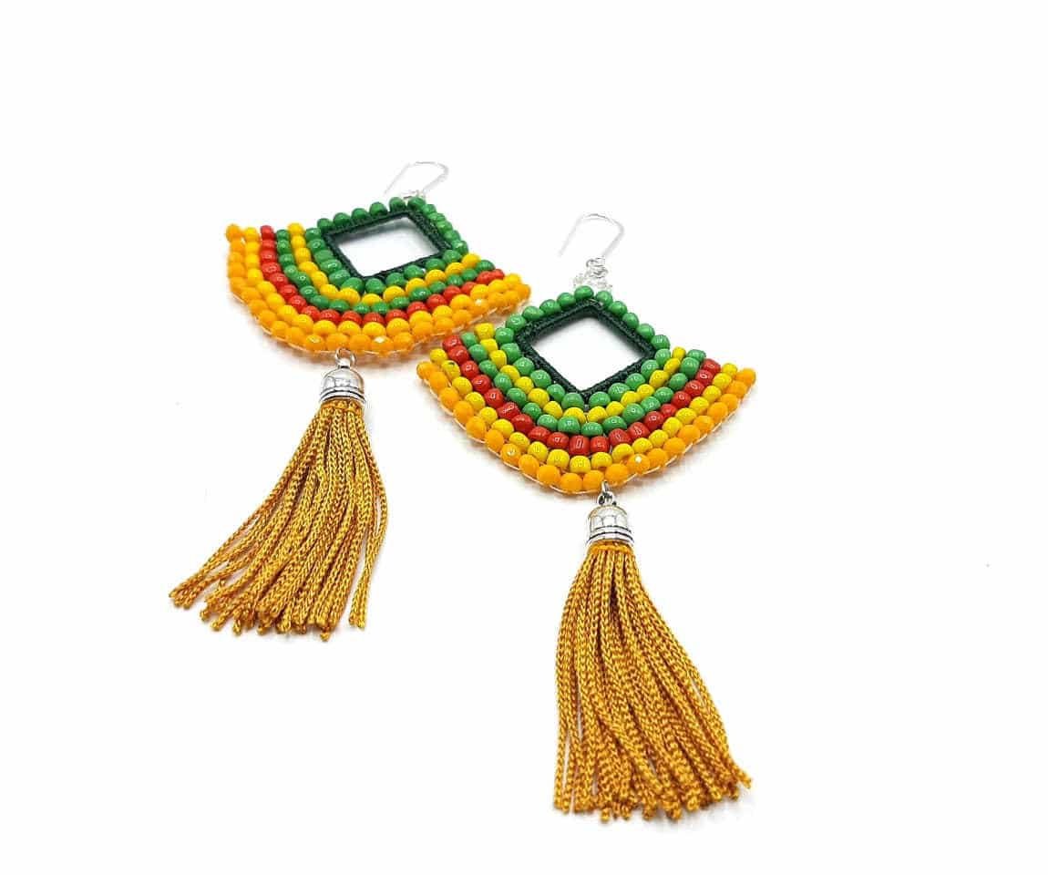 Yellow crystal earrings are made with seed beads, crystal beads, tassels, 100% nylon thread, and sterling silver hooks.
